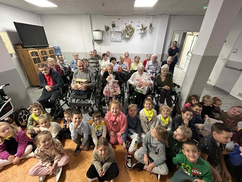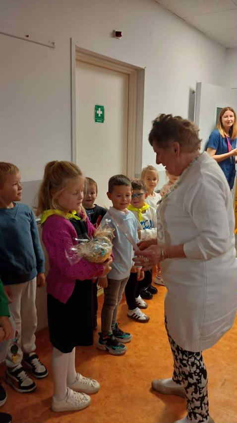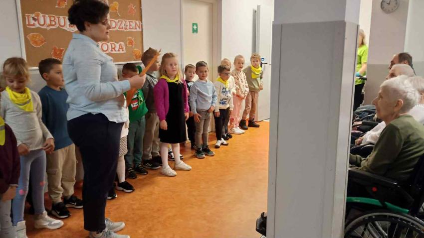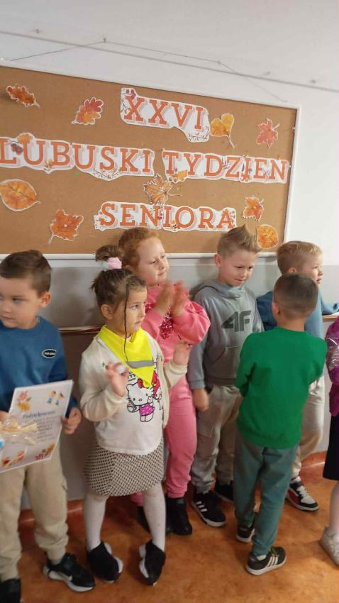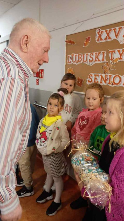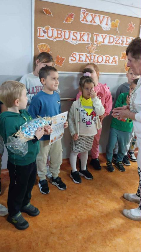 13.10.2025 dzieci z grupy 6 - latków odwiedziły Seniorów z Domu Seniora. Na spotkanie to przygotowały jesienny taniec oraz krótkie wierszyki. Obchodząc lubuski tydzień seniora całe przedszkole uczestniczyło w akcji ,,Herbatka dla Seniora?, dary zostały przekazane na ręce podopiecznych, by umilić im długie jesienne wieczory. Seniorzy przekazali dzieciom słodkie podziękowanie za odwiedziny.